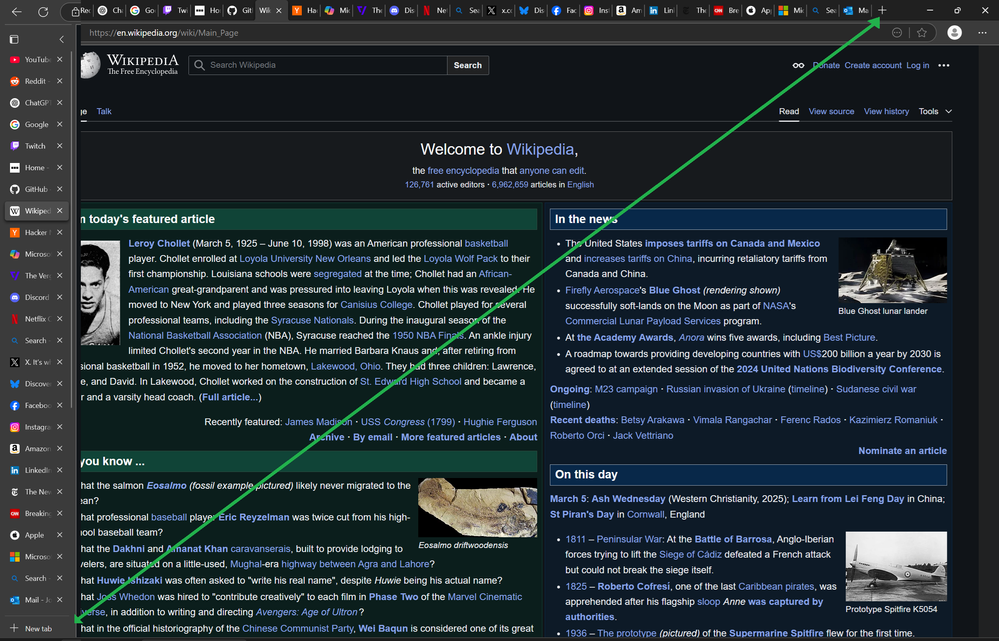 Vertical tabs mode is best for users that have many tabs open, but for users that have many tabs open, that means the new tab button is almost always located at the bottom of the screen. That is a problem - especially for people trying vertical tabs mode for the first time - because the "cost" or "friction" of clicking the new tab button is much higher compared to what that person is used to. The user has to move the cursor too far and it takes too long to reach the new tab button all the way in the bottom left corner of the screen. It is a very large regression in UX efficiency and I'm very confident this is a big reason why so many users don't stick with vertical tabs. Below is a screenshot where I superimpose vertical tabs mode on top of normal horizontal tabs mode and drew a green arrow line so you can see where the user is used to the new tabs button being compared to the vertical tabs mode position. That is is a massive change and increase in cursor distance.