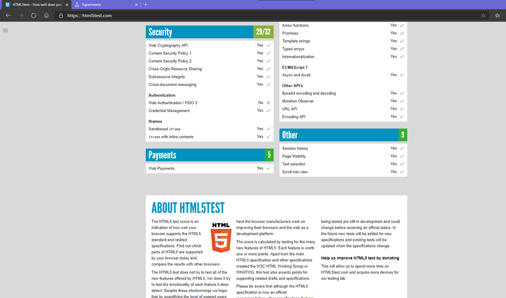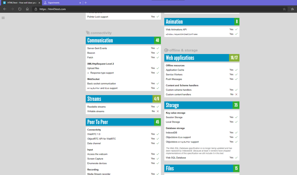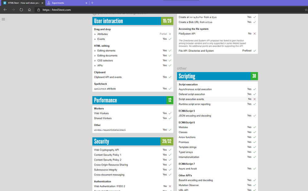 here is the list of features and HTML5 capabilities that are not supported (as stated by that website: https://html5test.com/ ) in the browser.