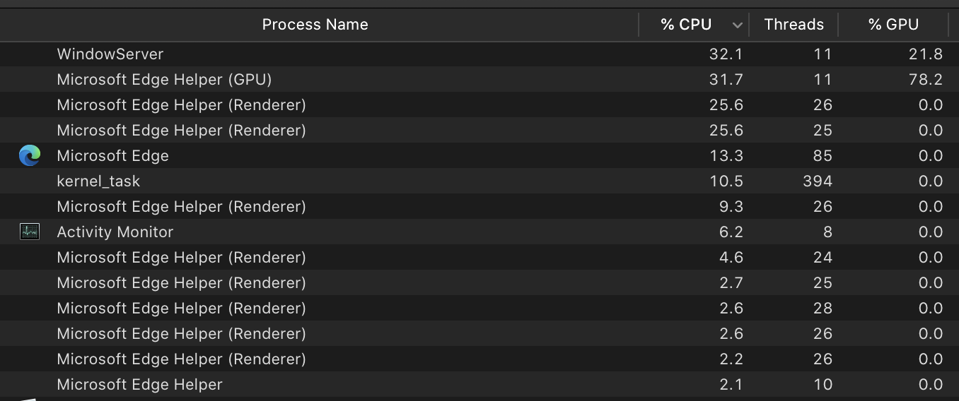 I've got a i7 6-core cpu and a [Radeon Pro 555X 4 GB] so mostly hoping to hand as much of the workload to the GPU as possible since at the moment Edge really chokes up when I have a bunch of tabs going and volume picks up (and nothing is graphically demanding in this scenario)