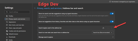 On Microsoft Edge Dev 95.0.1000.0, type search terms into the address bar and hit enter. Nothing happens. I also noticed that highlighting text and right-clicking no longer has the option to search ...