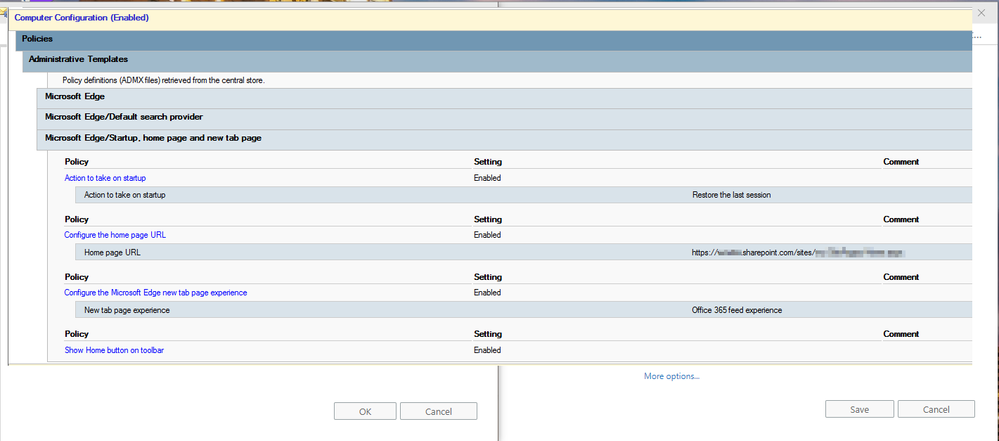 I'm looking for the best approach to customize Edge through ADMX/GPO. At first, I wanted to set the homepage/startpage as My Company Site. I have tried to do the same by importing Stable version of Edge ADMX into Central Store and set below policies from "Computer Configuration\Policies\Administrative Templates\Microsoft Edge\"