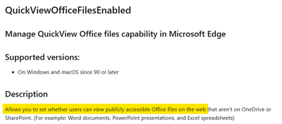 Mar 25, 2024Kaj__ Hello - My understanding about the QuickViewOfficeFilesEnabled policy is that the files need to be publicly accessible.