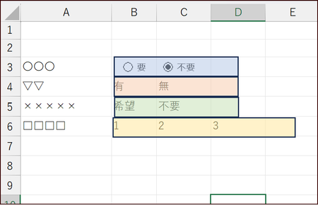 Excelで選択フォームを作成し、横一列に並んだ選択肢から1つだけ選べるようにするには、オプションボタン(ラジオボタン)を使用します。以下に手順を示します。