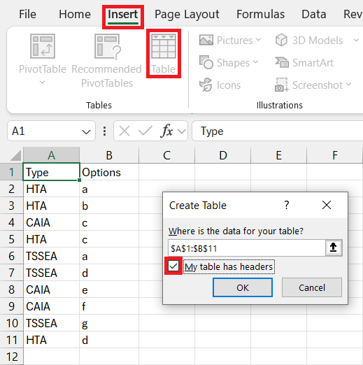 cking1333 There's a few ways this can be accomplished. In the following example, I've used a structured Excel table on Sheet1 to hold the 2-column list, and I've named the two combo boxes cboType (parent) and cboOptions (dependent)...