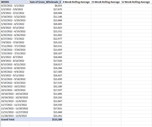 I am trying to calculate the following averages in an excel pivot table based on grouped fields using the 4 week rolling average 13 week rolling average 52 week rolling average