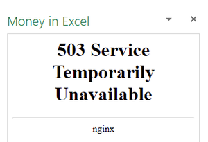 For the last two days when I start the latest version of Money in Excel, I immediately get: "503 Service Temporarily Unavailable" Any advice would be appreciated.