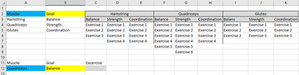 =OFFSET($C$3,0,(MATCH($A$12,$A$2:$A$4,0)-1)*3+MATCH($B$12,$B$2:$B$4,0)-1,COUNTA(OFFSET($C$3,0,(MATCH($A$12,$A$2:$A$4,0)-1)*3+MATCH($B$12,$B$2:$B$4,0)-1,maxExercises)))in third sheet attached