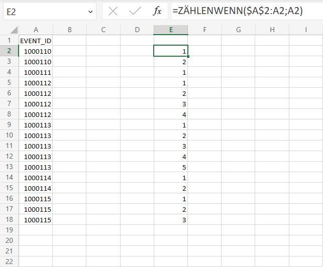 Im looking for the formula to add a 'count number' in column E in relation to Col A EVENT_ID.