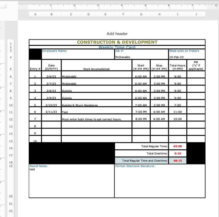 The formula that I used to get total hours in block I16: =sum(I6:I15
