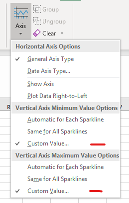 Thanks for your reply! I've tried these settings the minimum and maximum value in the vertical axis box but the sparkline then changes into a strange line.