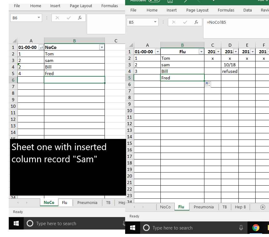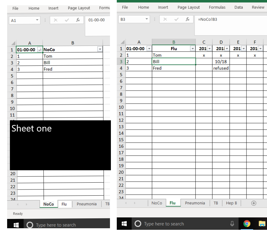 In NoCo!A2, enter the formula =ROW()-1, then copy it down. In Flu!A2, enter the formula =INDEX(NoCo!A:A,ROW()), copy to B2, and down the rows. Do the same for Pneumonia!A2 and TB!A2.- tom_gowenCopper Contributor