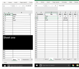 In NoCo!A2, enter the formula =ROW()-1, then copy it down. In Flu!A2, enter the formula =INDEX(NoCo!A:A,ROW()), copy to B2, and down the rows. Do the same for Pneumonia!A2 and TB!A2.