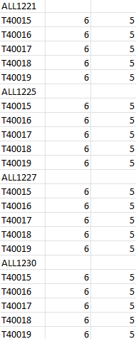 Sub items() Dim i, j As Long Range("A:C").Clear j = 1 For i = 1 To 1200 If i Mod 6 = 1 Then Cells(i, 1).Value = Cells(j, 11).Value j = j + 1 Else Select Case i Mod 6 Case Is = 2 Cells(i, 1).Value = "T40015" Case Is = 3 Cells(i, 1).Value = "T40016" Case Is = 4 Cells(i, 1).Value = "T40017" Case Is = 5 Cells(i, 1).Value = "T40018" Case Is = 0 Cells(i, 1).Value = "T40019" End Select Cells(i, 2).Value = 6 Cells(i, 3).Value = 5 End If Next i End SubIn the attached file you can click the button in cell E2 to run the macro which enters the unique customer id's from range K1:K200 in column A.