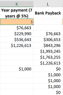 I am trying to find a way to add up different financing and paybacks. The "3" in the input cell is the number of years each payment will be paid back. The different payments are below the "3". I ne...