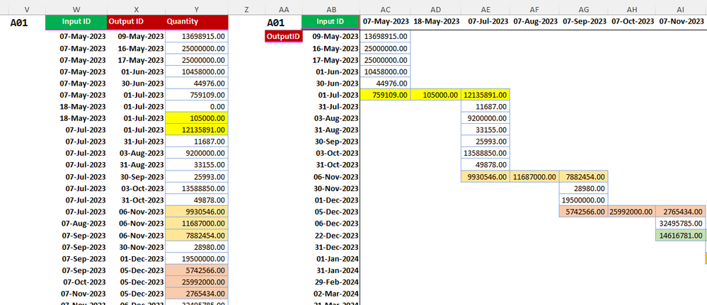 = LET( ID, "A01", outputID, FILTER(Receipts[Receipt Date], Receipts[ID]=ID), outputQty, FILTER(Receipts[Amount], Receipts[ID]=ID), inputID, FILTER(Challan[CIN Date], Challan[ID]=ID), inputQty, FILTER(Challan[Amount], Challan[ID]=ID), resultArr, FIFOλ(outputID,outputQty,inputID,inputQty,SIGN(inputQty),2), resultArr )FIFOλ stacks all input and output events in order of accumulated quantity into a single array and sorts by accumulated quantity. With 365 insider the output can be switched between a basic table format and crosstab using PIVOTBY.