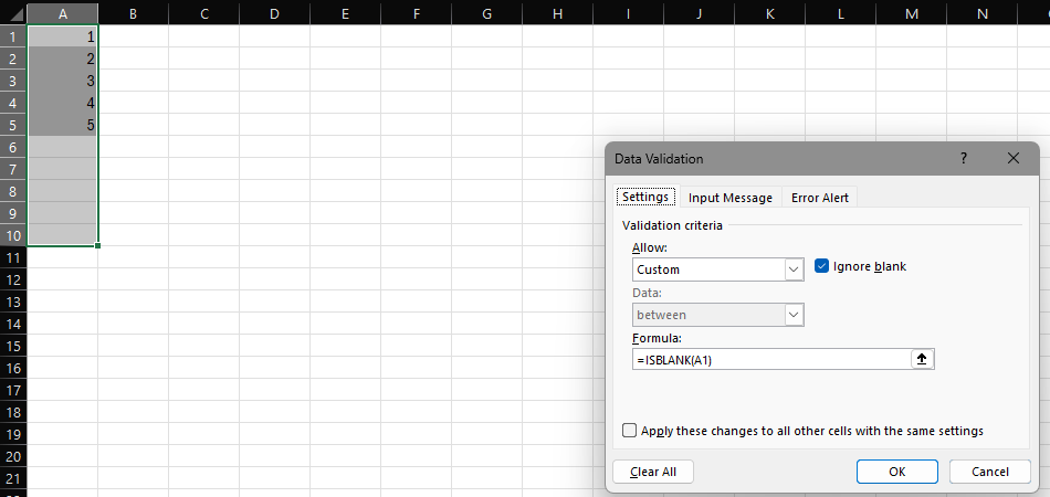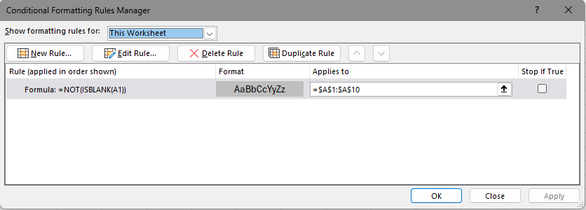 Instead of using a static reference like =ISBLANK(A1), we need to ensure that the formula applies dynamically to all cells in the range.