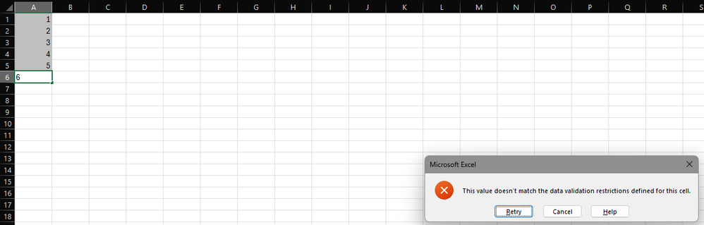 The issue I'm having is I can't type in 6 on A6 after I setup the data validation. These are the current settings I have on Data validation screen.