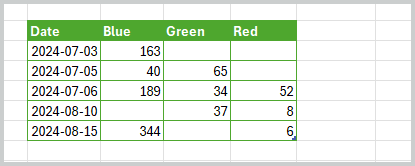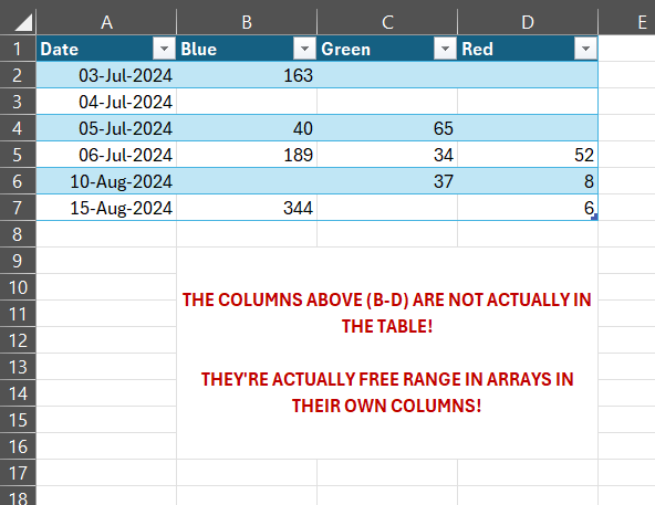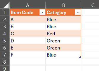 In the final table I pretty much just have a table with the Dates. The file I uploaded has a total of 4 columns in this table, but in my actual document the last 3 columns are actually arrays. I just placed them inside the table for purposes of this example. Anyhow, columns B-D are the Categories each Item Code belongs to: Blue, Green, or Red.