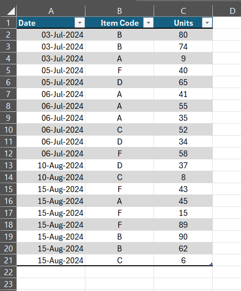 =LET( grϑup, TRANSPOSE(GROUPBY(Table1[Category], Table1[Item Code], LAMBDA(x, LAMBDA(x)), 0, 0)), bcλst, LAMBDA(b, IF(b, Table3[Date], TAKE(grϑup, -1))), result, MAP(bcλst({0}), bcλst({1}), LAMBDA(c,d, SUM(SUMIFS(Table2[Units], Table2[Date], d, Table2[Item Code], c())))), HSTACK(Table3[[#All],[Date]], VSTACK(TAKE(grϑup, 1), result)) )