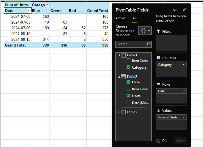 =SUMPRODUCT(Table2[Units], (Table2[Date]=[@Date])*(XLOOKUP(Table2[Item Code], Table1[Item Code], Table1[Category])=Table3[[#Headers],[Blue]]))