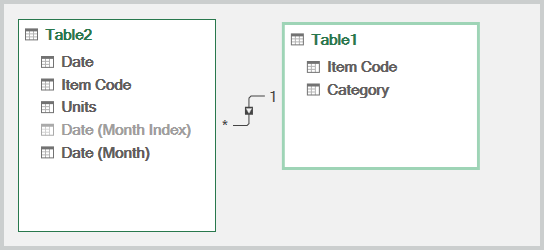 let Source = Excel.CurrentWorkbook(){[Name="Table2"]}[Content], DeclareType = Table.TransformColumnTypes(Source,{{"Date", type date}}), MergeTable1 = Table.NestedJoin(DeclareType, {"Item Code"}, Table1, {"Item Code"}, "Table1", JoinKind.LeftOuter), ExpandTable1 = Table.ExpandTableColumn(MergeTable1, "Table1", {"Category"}, {"Category"}), SelectColumns = Table.SelectColumns(ExpandTable1,{"Date", "Category", "Units"}), PivotColumn = Table.Pivot(SelectColumns, List.Distinct(SelectColumns[Category]), "Category", "Units", List.Sum) in PivotColumn