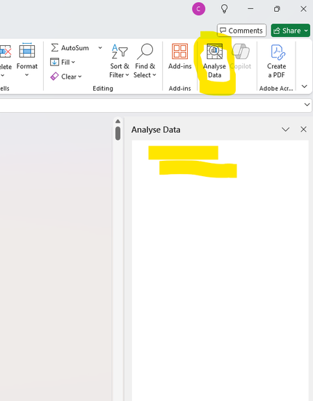Hello I'm using MS Office 365 and would like to use the 'Analyse Data' tool, but when I select it, it just remains blank. I've tried to disable and re-enable the ToolPak, but problem still persists...