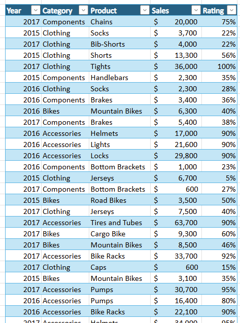 Bike sales table showing columns for Year, Category, Product, Sales and Rating.