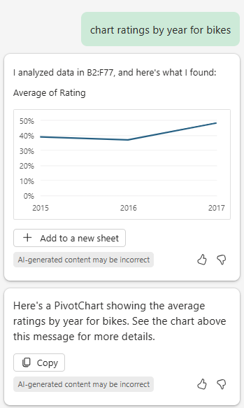 Copilot in Excel pane showing the above prompt and a chart showing the average rating of bikes for the years 2015-2017.