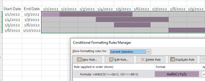 Hello, I am working on a Gantt chart style calendar which will show when a promotion is running. I am using an AND function to pull this information through via Conditional Formatting. On a small...