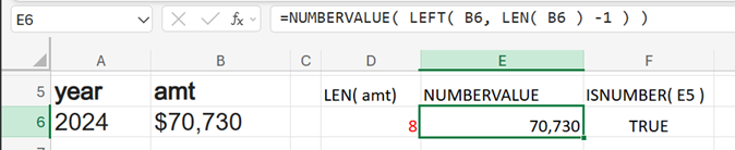 =NUMBERVALUE( LEFT( B6, LEN( B6 ) -1 ) )(tried to get rid of the invisible/unprintable char. with CLEAN(B6) - didn't work)