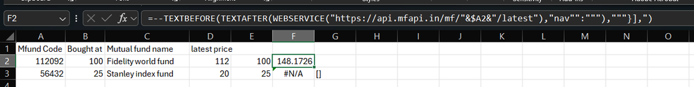 =--TEXTBEFORE(TEXTAFTER(WEBSERVICE("https://api.mfapi.in/mf/"&$A2&"/latest"),"nav"":"""),"""}],")where A2 is where the Mfund Code is located