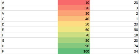 - Repeat, but with formula =$B$2=20 and a lighter color red, etc.