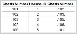 Do you mean repeated Chasis Number could be the same in any row of column A and/or in any row of column C, not the same numbers in the same row? If the former, for which rows to take License ID?