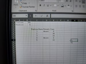 =IF(D5="Absent",0,QUOTIENT($A$1,$A$2-COUNTIF($D$5:$D$9,"Absent"))+(COUNTIF(D$5:D5,"<>Absent")<=MOD($A$1,$A$2-COUNTIF($D$5:$D$9,"Absent"))))