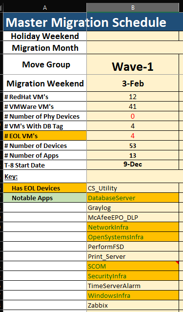 Within this tab I have a list of Application names in column "A" called "Tags", and a list of list of move groups in column "C" called "Wave". I am trying to automatically update another tab called schedule within the "A: column. So when an Application is put into a Wave group in the RunBook Meeting Schedule it automatically gets recorded on the Schedule Tab within Column "A".