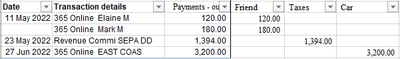 You can see payments to my friends Elaine ad Mark, Payment of my taxes and payments for a car.