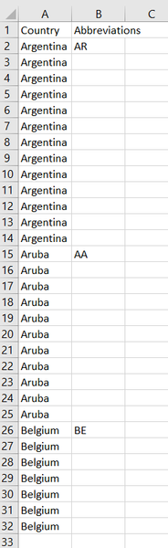 Hi - I need help categorizing content/ auto-fill from the column A to column B. For example, all the cells in column A with "Argentina" automatically abbreviates to "AR" in corresponding row in colum...