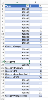 Column A comes from a copied data dump. I need column B to start with the number value one and assign each Value from column A a number when it changes. For example: 400100 is my first entry and...