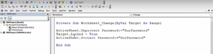 Private Sub Workbook_BeforeClose(Cancel As Boolean) On Error Resume Next With Worksheets("My Sheet") .Unprotect Password:="OurPassword" .Cells.SpecialCells(xlCellTypeFormulas).Locked = True .Cells.SpecialCells(xlCellTypeConstants).Locked = True .Protect Password:="OurPassword" End With End Sub