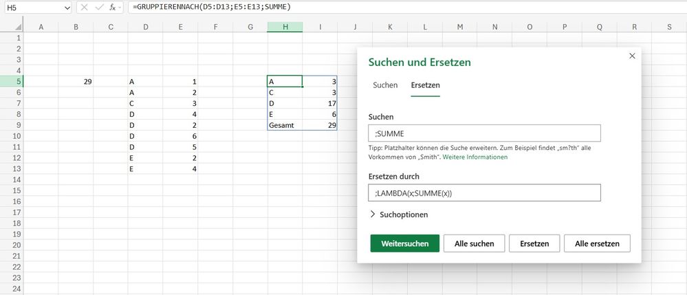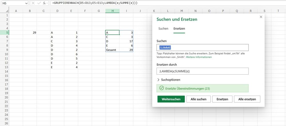 In my sample file in german Excel i've made 23 changes in one step. Using ";SUMME" with ";" in the beginning should prevent unintended changes in other parts.