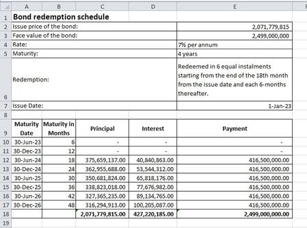 Hello, A bond will be issued now at price USD 2,071,779,815 and maturity value USD 2,499,000,000 after 4 years @ 7% per annum. Bond will be redeemed in 6 equal instalments starting from the end o...