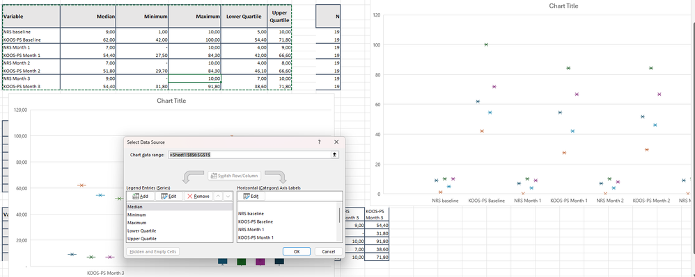 First attempt creates correct plot but without separate labels and if I include a "horizontal axis" it will not let me edit itSecond attempt lists correct horizontal series titles but has separated out all the data points into their own "box and whisker" plot