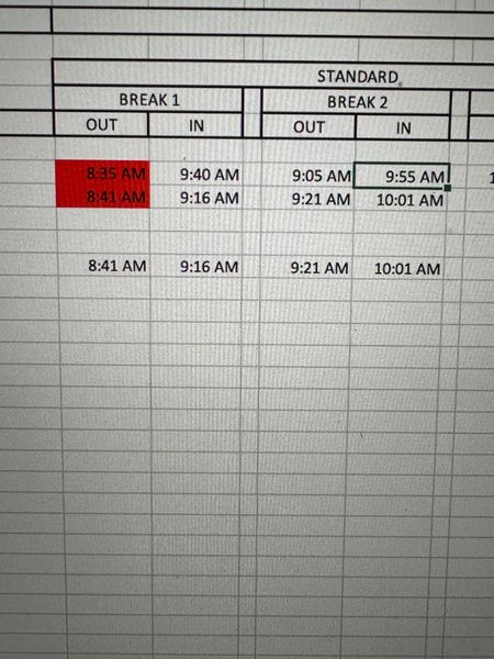 I am trying to make a break schedule in cell C8 name is OUT and D8 is IN how to get the the both cell turn red when the time goes over 36 minutes. I tried many different way but only one of ...