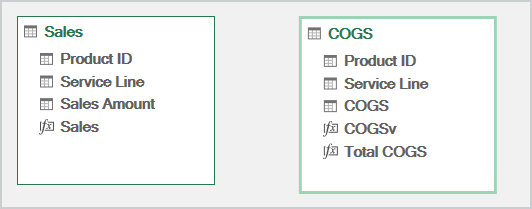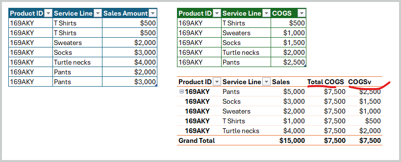 COGS from table 2 also has the data broken out by Service Line (T-shirts, Sweaters, etc.), but will only show an aggregate COGS value for all service lines for each unique product ID, instead of breaking it out by Service Line. This is because the Service Line column is being inserted into the power pivot table from table 1, it breaks out sales by Service Line. If you insert the Service Line data column into the power pivot from table 2, COGS would be broken out by Service Line, and only an aggregate for sales would be produced. Ideally the power pivot would display sales AND COGS broken out by Service Line (and Product ID).