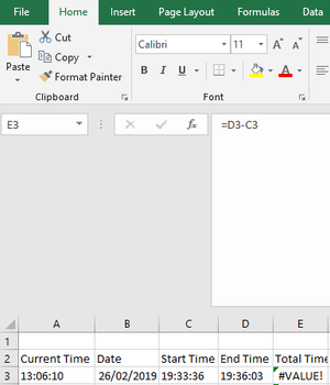 I'd like to ask for help regarding a #VALUE error I am receiving when subtracting time duration. End Time - Start Time. I use the simple formula =D4-C4 but the error shows on E4 cell where the formu...