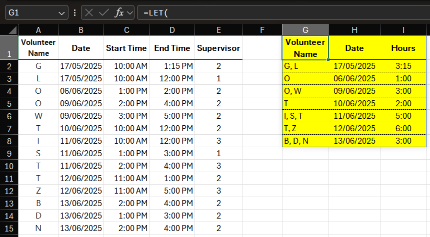 Yes, the real-world situation is 300+ volunteers entering shifts across 3 summer months at 28 locations with 30-40 supervisors, and shifts aren't necessarily adjacent, so Lucy might supervise 2 volunteers from 10:00-noon, 1 volunteer from 11:30am-1pm, and then have an hour off and then have volunteers in from 3:00-5:00pm, so just taking MIN to MAX (10am-5pm) wouldn't be accurate. Some volunteers come in every day, some only once a week, but by the end of the summer, I have upwards of 10,000 rows of time entries.