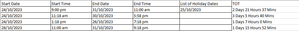 Operation Hours for Monday to Saturday : 9:30am to 10pm Operation Hours for Sunday : 9:30am to 6pm TOT is the total time taken task took during operation hours only excluding Holidays Dates He...