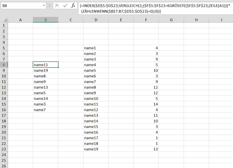 =INDEX($D$5:$D$23,MATCH(1,($F$5:$F$23=LARGE($F$5:$F$23,ROW(A1)))*(COUNTIF($B$7:B7,$D$5:$D$23)=0),0))An alternative with e.g. Excel 2013 could be this formula. Enter the formula with ctrl+shift+enter if you don't work with Office 365 or Excel 2021. The formula is in cell B8 and filled down.