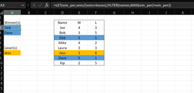 =LET(win_per,wins/(wins+losses),FILTER(names,MAX(win_per)=win_per))For Loser(s)