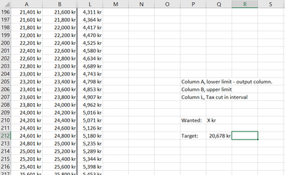 In this case, I want to use the same table to calculate it backwards, so the same example would be phrased as, how much do I have to earn to receive (at least) 18000 kr after taxes. The output needed is in column A, so the answer would be 22601.